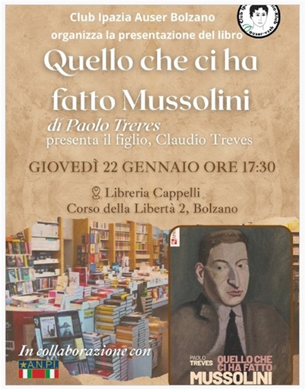 Giovedi 22 gennaio alle ore 17.30 presso la Libreria Cappelli - Corso Libertà 2 Bolzano - presentazione del libro "Quello che ci ha fatto Mussolini" di Paolo Treves .