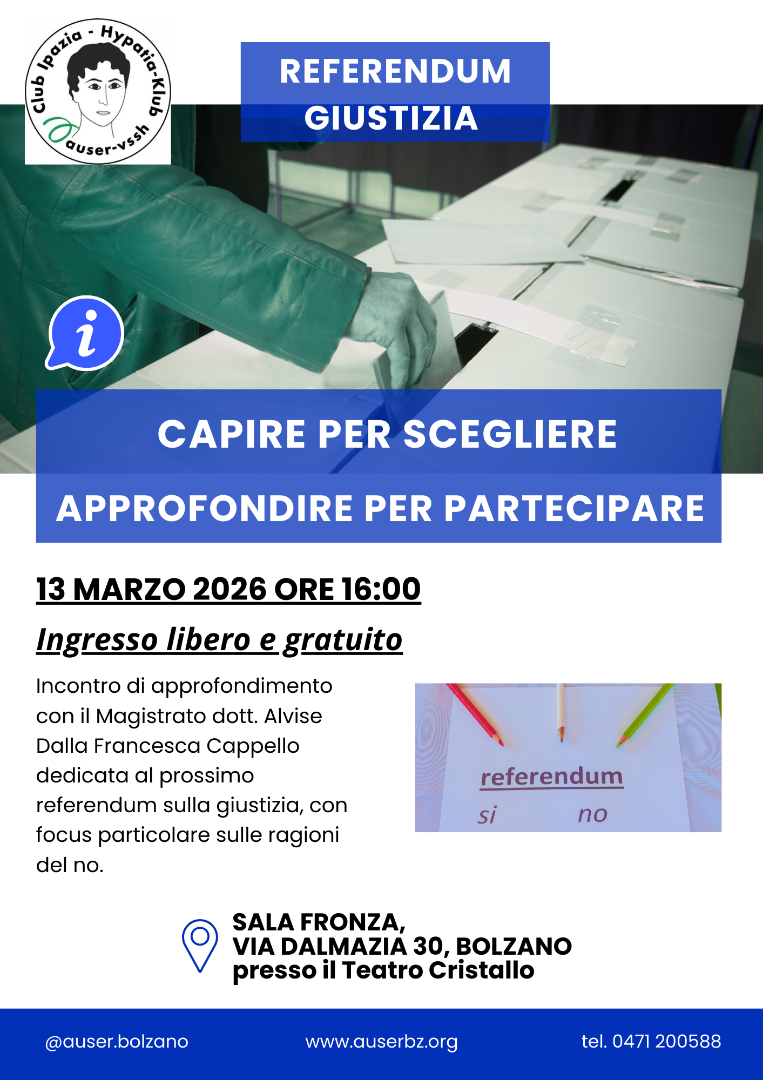 L'incontro si svolgerà il 13 marzo 2026, alle ore 16:00, presso la Sala Fronza in via Dalmazia 30, presso il Teatro Cristallo di Bolzano.
